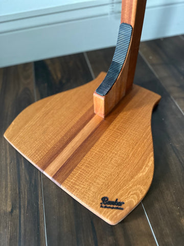 Custom guitar stand made from a combination of Flame and Sinker Honduran Mahogany. Felt feet on the bottom protects your floors, vintage Flying V leg rest rubber protects your instruments finish, and a String Swing cradle to protect ya neck. Each of these stands has its own unique shape because they are made from guitar cutoffs which vary greatly in size and dimension. This one is ideal for up to medium sized guitars such as Les Pauls, Strats, PRS, etc. It will NOT fit bass guitars, Firebirds, or any other XL body length (though it does fit an Explorer with around 2 inches of ground clearance). The stand ships in two pieces and requires some light assembly with two Allen bolts (supplied).